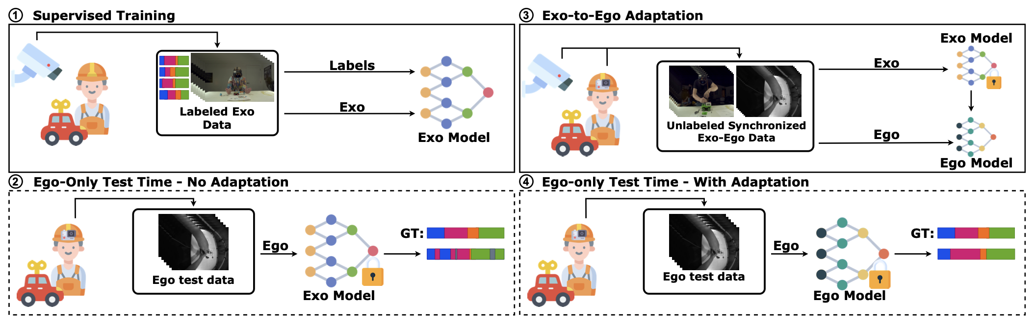 Camillo Quattrocchi, Antonino Furnari, Daniele Di Mauro, Mario Valerio Giuffrida, Giovanni Maria Farinella (2024). Synchronization is All You Need: Exocentric-to-Egocentric Transfer for Temporal Action Segmentation with Unlabeled Synchronized Video Pairs In European Conference on Computer Vision (ECCV).
