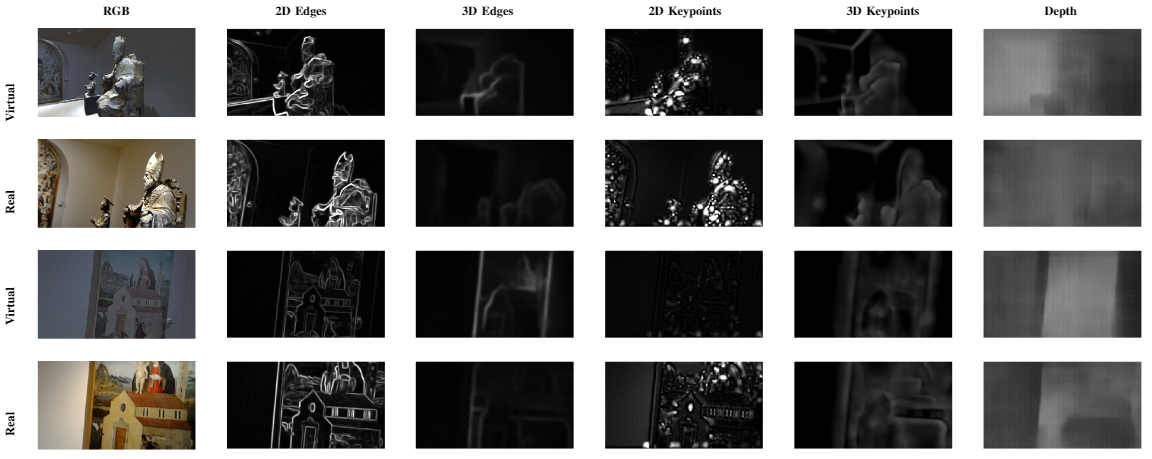 Fig. 3: Examples of mid-level representations extracted with the corresponding RGB images. We report two pairs of virtual and real images.