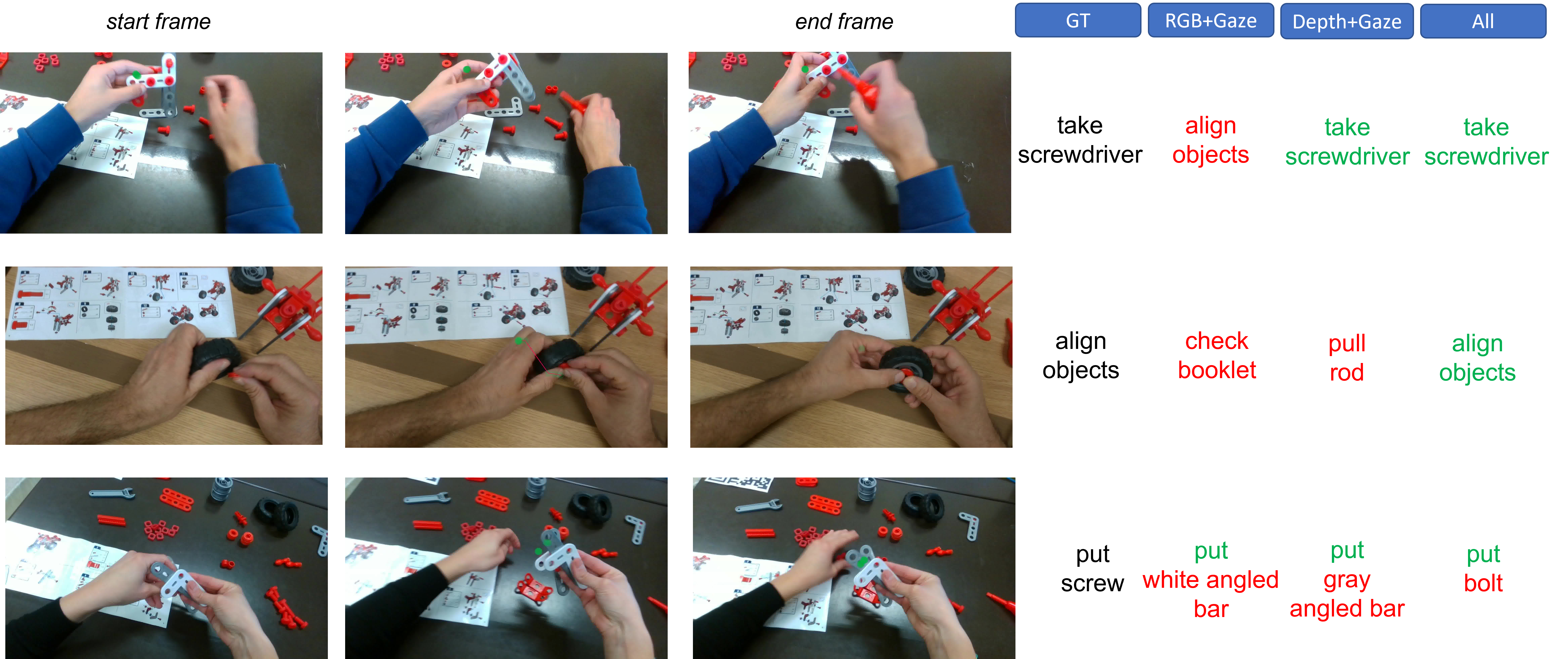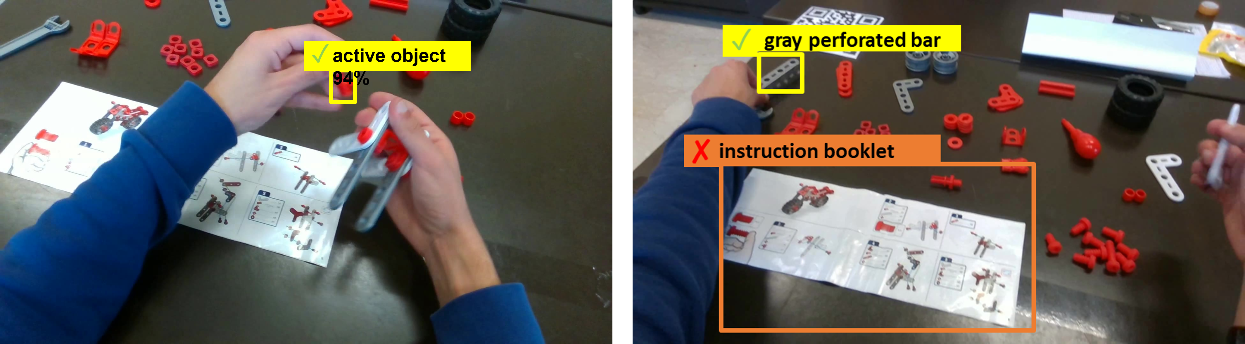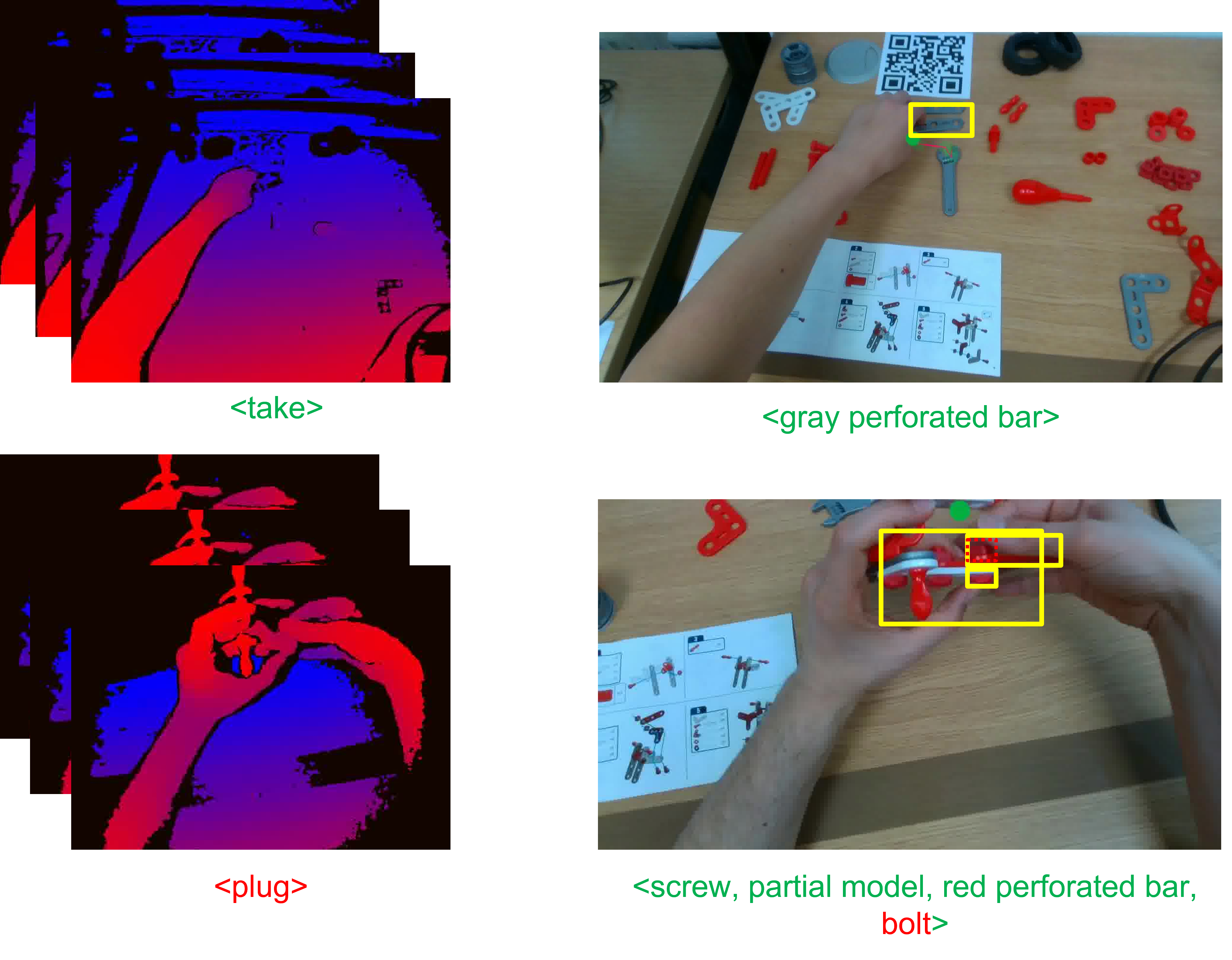 MECCANO Multimodal comprises multimodal egocentric data acquired in an industrial-like domain in which subjects built a toy model of a motorbike. The multimodality is characterized by the gaze signal, depth maps and RGB videos acquired simultaneously. We considered 20 object classes which include the 16 classes categorizing the 49 components, the two tools (screwdriver and wrench), the instructions booklet and a partial_model class.
