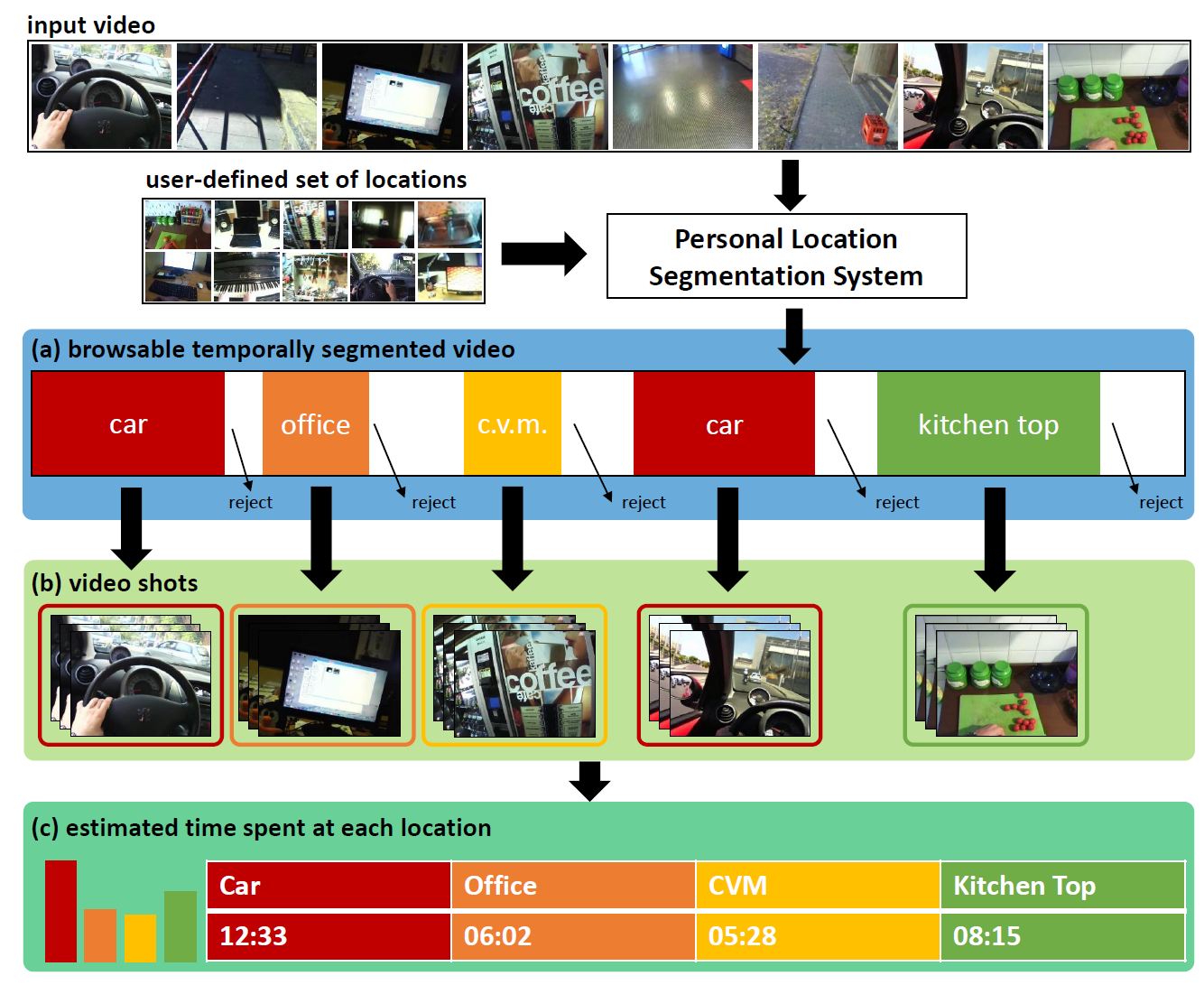 Scheme of the proposed temporal segmentation system. The system can be used to (a) produce a browsable temporally segmented egocentric video, (b) produce video shots related to given locations of interest, (c) estimate the amount of time spent at a specific location.