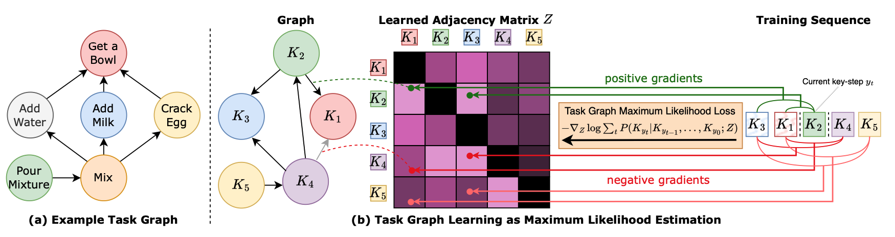 Procedural activities are sequences of key-steps aimed at achieving specific goals. They are crucial to build intelligent agents able to assist users effectively. In this context, task graphs have emerged as a human-understandable representation of procedural activities, encoding a partial ordering over the key-steps. While previous works generally relied on hand-crafted procedures to extract task graphs from videos, in this paper, we propose an approach based on direct maximum likelihood optimization of edges’ weights, which allows gradient-based learning of task graphs and can be naturally plugged into neural network architectures. Experiments on the CaptainCook4D dataset demonstrate the ability of our approach to predict accurate task graphs from the observation of action sequences, with an improvement of +16.7% over previous approaches. Owing to the differentiability of the proposed framework, we also introduce a feature-based approach, aiming to predict task graphs from key-step textual or video embeddings, for which we observe emerging video understanding abilities. Task graphs learned with our approach are also shown to significantly enhance online mistake detection in procedural egocentric videos, achieving notable gains of +19.8% and +7.5% on the Assembly101 and EPIC-Tent datasets. Code for replicating experiments will be publicly released.