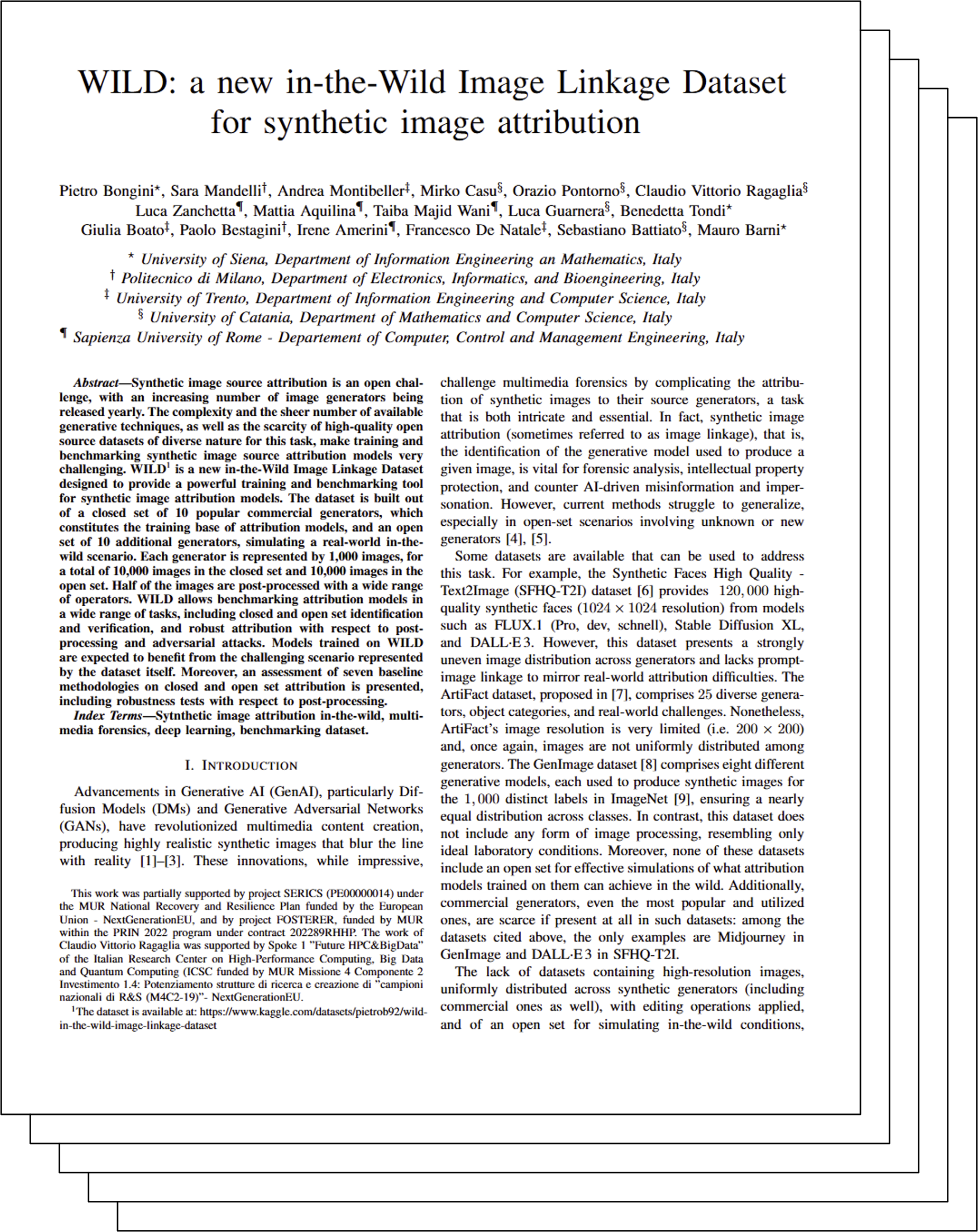 Pietro Bongini, Sara Mandelli, Andrea Montibeller, Mirko Casu, Orazio Pontorno, Claudio Vittorio Ragaglia, Luca Zanchetta, Mattia Aquilina, Taiba Majid Wani, Luca Guarnera, Benedetta Tondi, Giulia Boato, Paolo Bestagini, Irene Amerini, Francesco De Natale, Sebastiano Battiato, Mauro Barni. (2025) WILD: a new in-the-Wild Image Linkage Dataset for synthetic image attribution. VERIMEDIA: International Workshop on Media Verification and Integrity - IJCNN. [WEB-SITE] [PAPER] [CITE] |