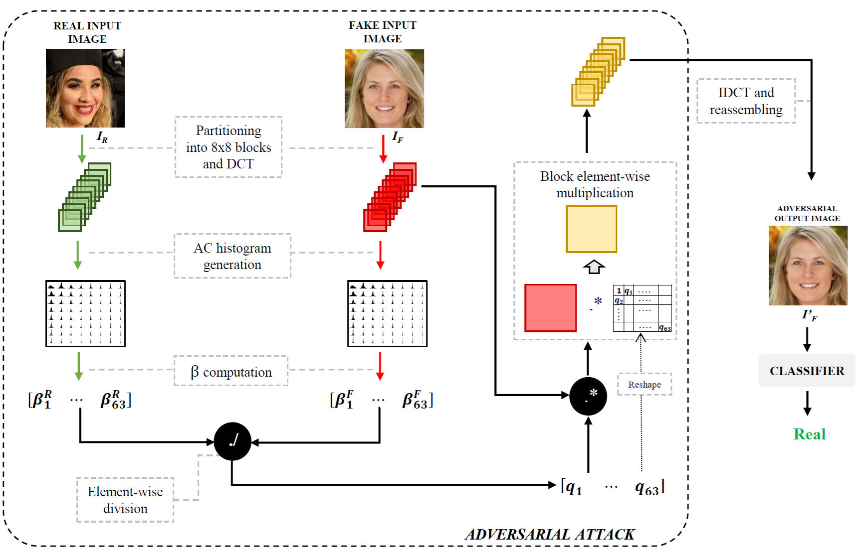 to rescale the DCT values computed from IF. The final adversarial fake image I'F is then obtained by applying the