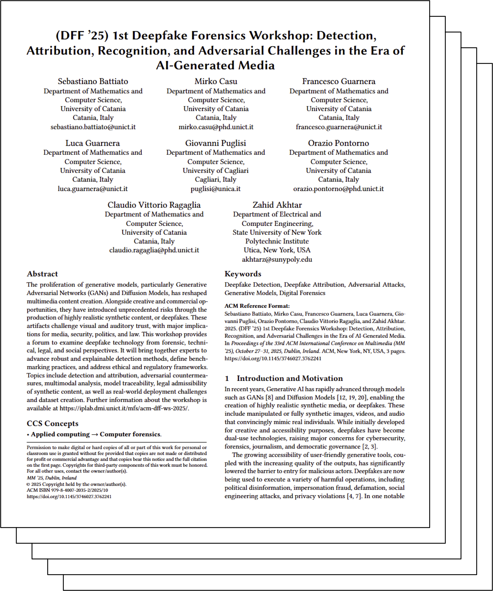The proliferation of generative models, particularly Generative Adversarial Networks (GANs) and Diffusion Models, has reshaped multimedia content creation. Alongside creative and commercial opportunities, they have introduced unprecedented risks through the production of highly realistic synthetic content, or deepfakes. These artifacts challenge visual and auditory trust, with major implications for media, security, politics, and law. This workshop provides a forum to examine deepfake technology from forensic, technical, legal, and social perspectives. It will bring together experts to advance robust and explainable detection methods, define benchmarking practices, and address ethical and regulatory frameworks. Topics include detection and attribution, adversarial countermeasures, multimodal analysis, model traceability, legal admissibility of synthetic content, as well as real-world deployment challenges and dataset creation.